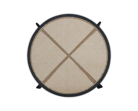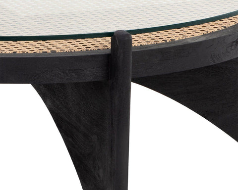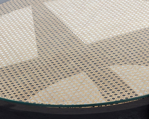 Inspired by global travels, this round coffee table blends old-world charm with modern style. Featuring a natural rattan top covered with clear glass and a sculpted black mango wood base, it offers a unique artisan-crafted design perfect for any contemporary living space. Each piece is one-of-a-kind with natural variations in texture and color.