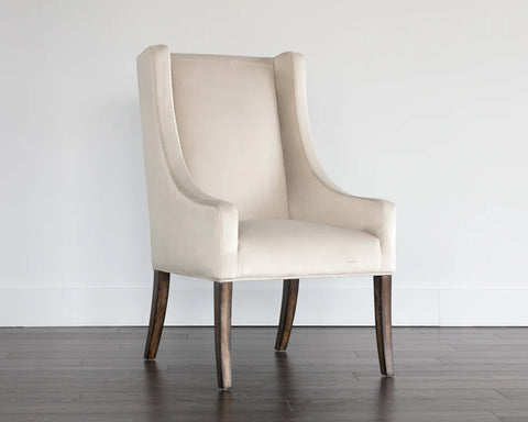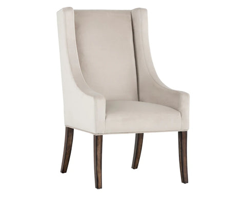 This oversized dining armchair features an elegant wing back style with contoured arms. Stocked in our soft piccolo prosecco performance fabric with smoked brown oak wood legs. Can also be used as an occasional chair in residential and contract environments. Performance fabric is moisture repellent, durable and easy to clean.
