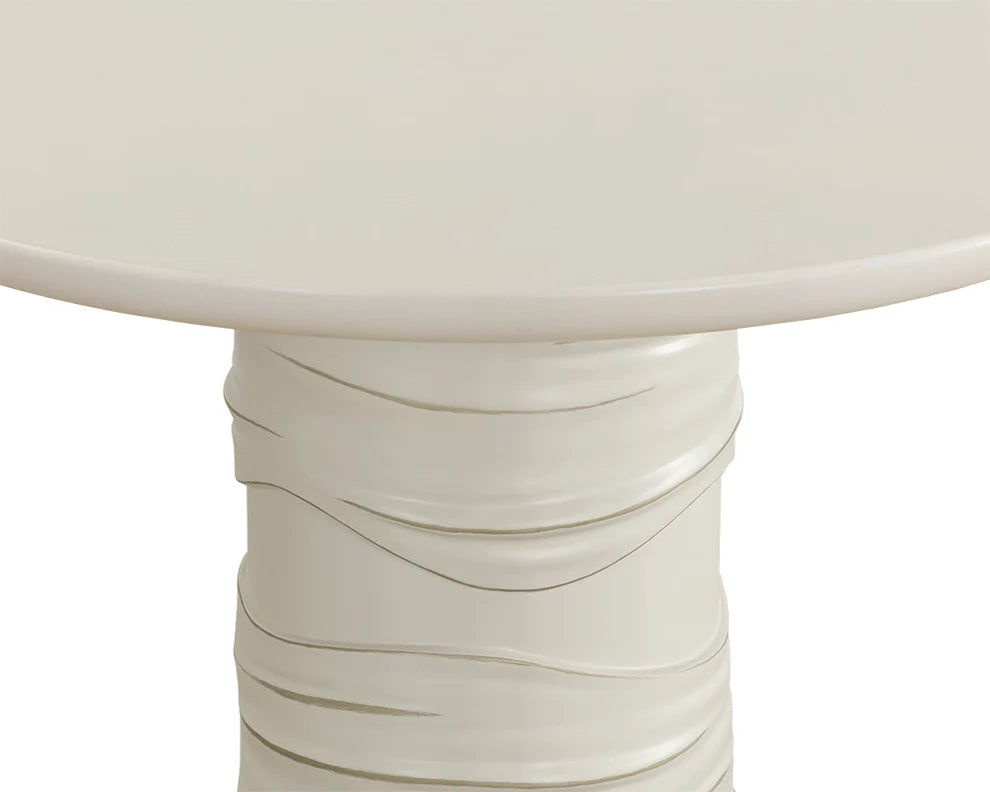 Inspired by the opulence of classical design, the Alanya Dining Table is reminiscent of a piece of art. Constructed from cream-coloured glass fibre-reinforced sealed concrete with curved ridges on the base. Hand painted brass accents give this piece a distinctive look.