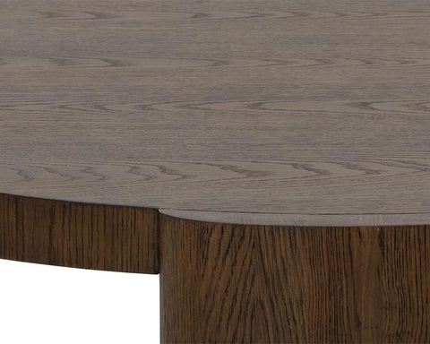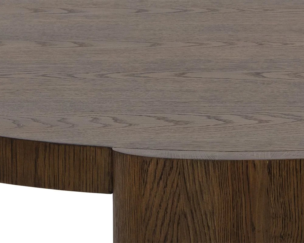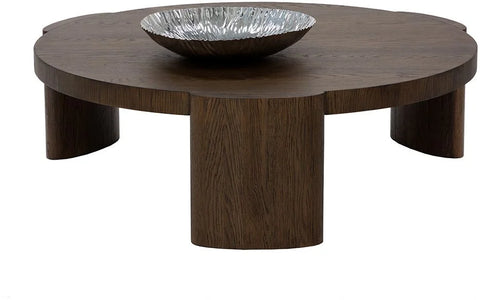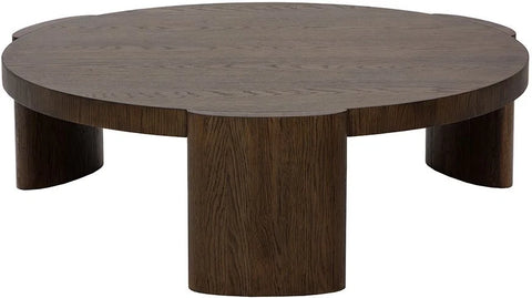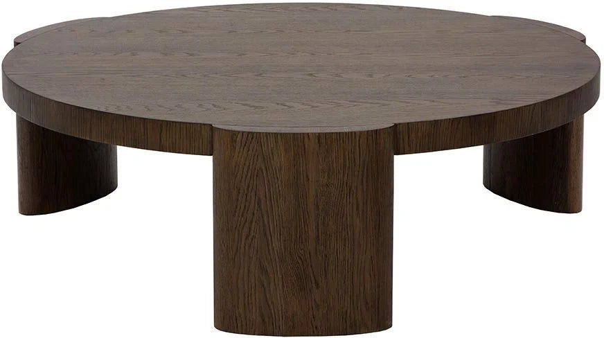 Inspired by modern design, this round coffee table features elegant oval-shaped legs for a refined, contemporary look. Crafted with a light brown oak veneer top and solid oak wood legs, it highlights natural wood grain, knots, and texture variations that make each piece unique. Suitable for both residential and commercial spaces.