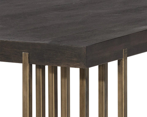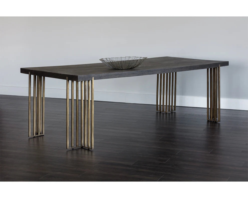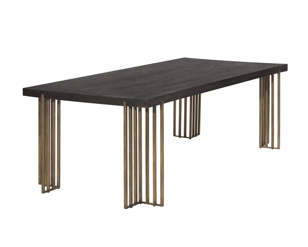 This dining table will bring warmth and style to various living and lounge spaces. The oak wood veneer top is complemented with architectural antique brass iron legs for added appeal. Cracks and deep lines in finish are part of the distressed look. Suitable for residential and contract environments. Seats up to eight.